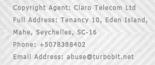 We kindly ask you to treat this request because Turbobit is working totally legally and with complete transparency. Every file of the system can be found on Turbobit servers through any possible internet resources. This fact can be very useful for the copyright holder as any file transmission can be tracked and we will be glad to help the copyright holder to protect his rights. We are ready for long-term cooperation with anybody who can help us locate dishonest usage of Site.